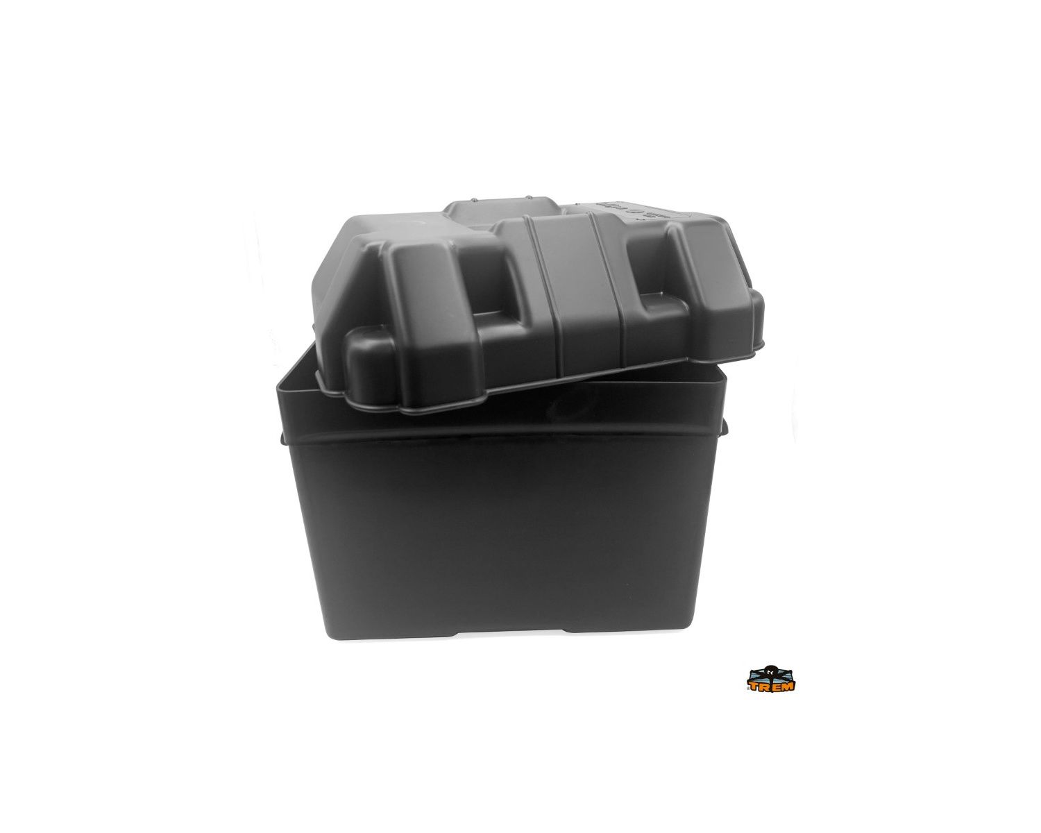 Bac à batterie en plastique avec couvercle et sangle de fixation.