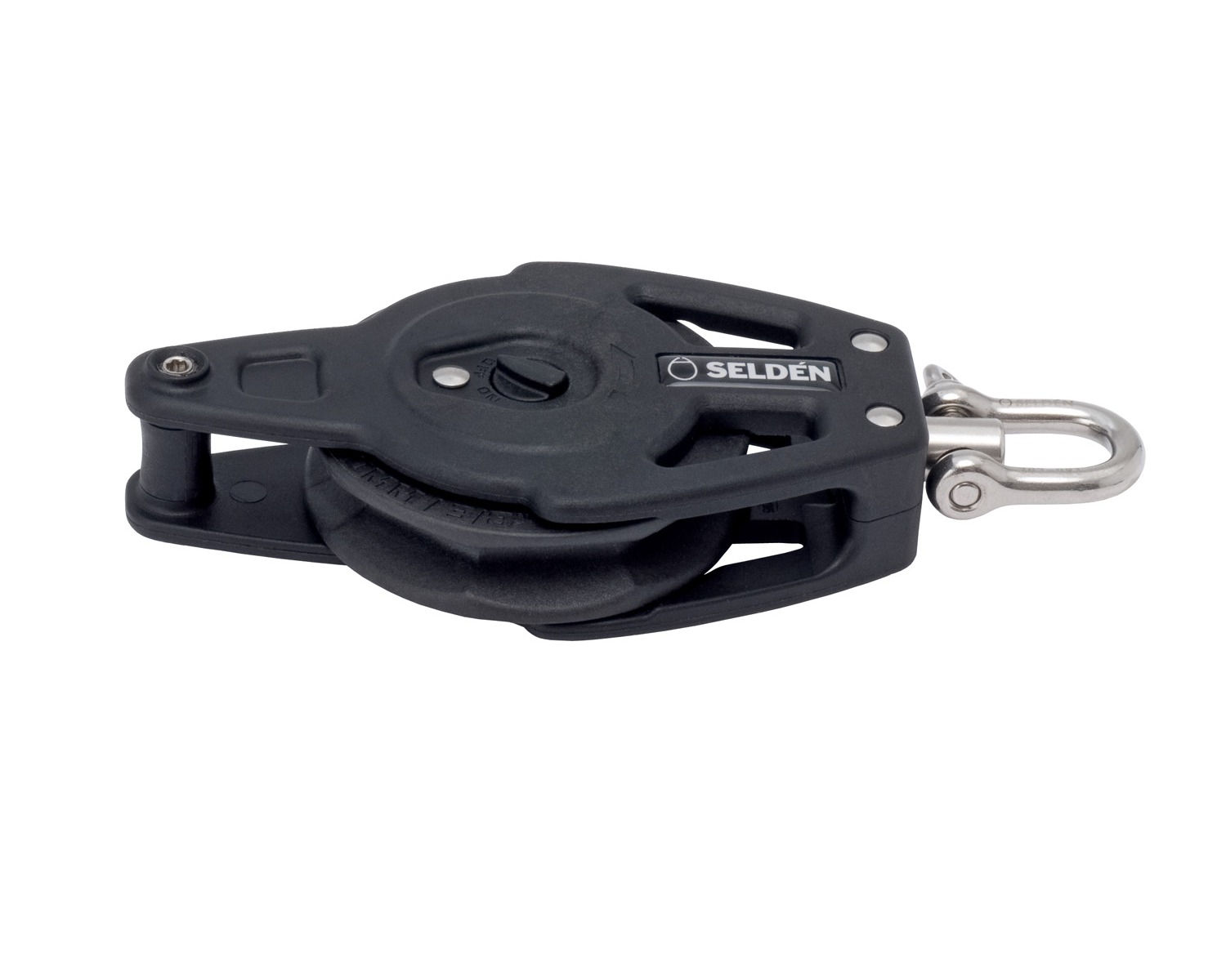 Poulie winch à billes en Delrin simple à ringot de Ø 5 mm dont le réa en aluminium, passe manuellement de la rotation libre au cliquet. Le poussoir permet d'engager ou de débrayer le cliquet.