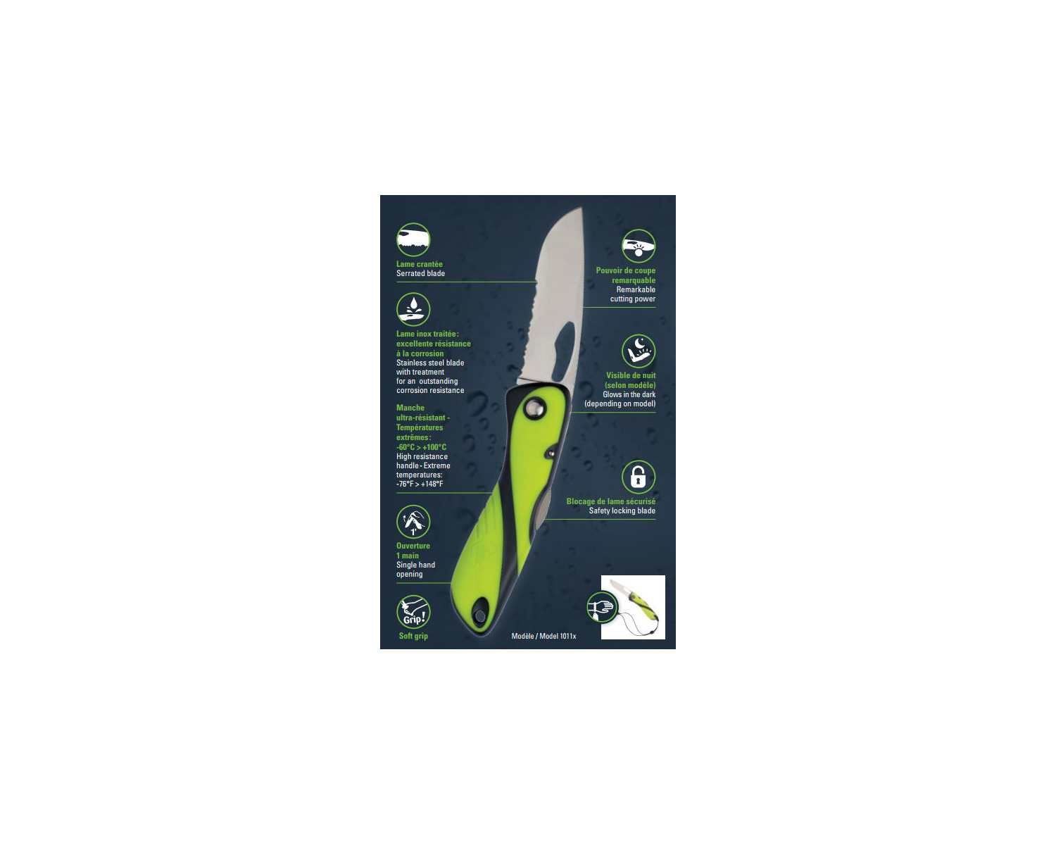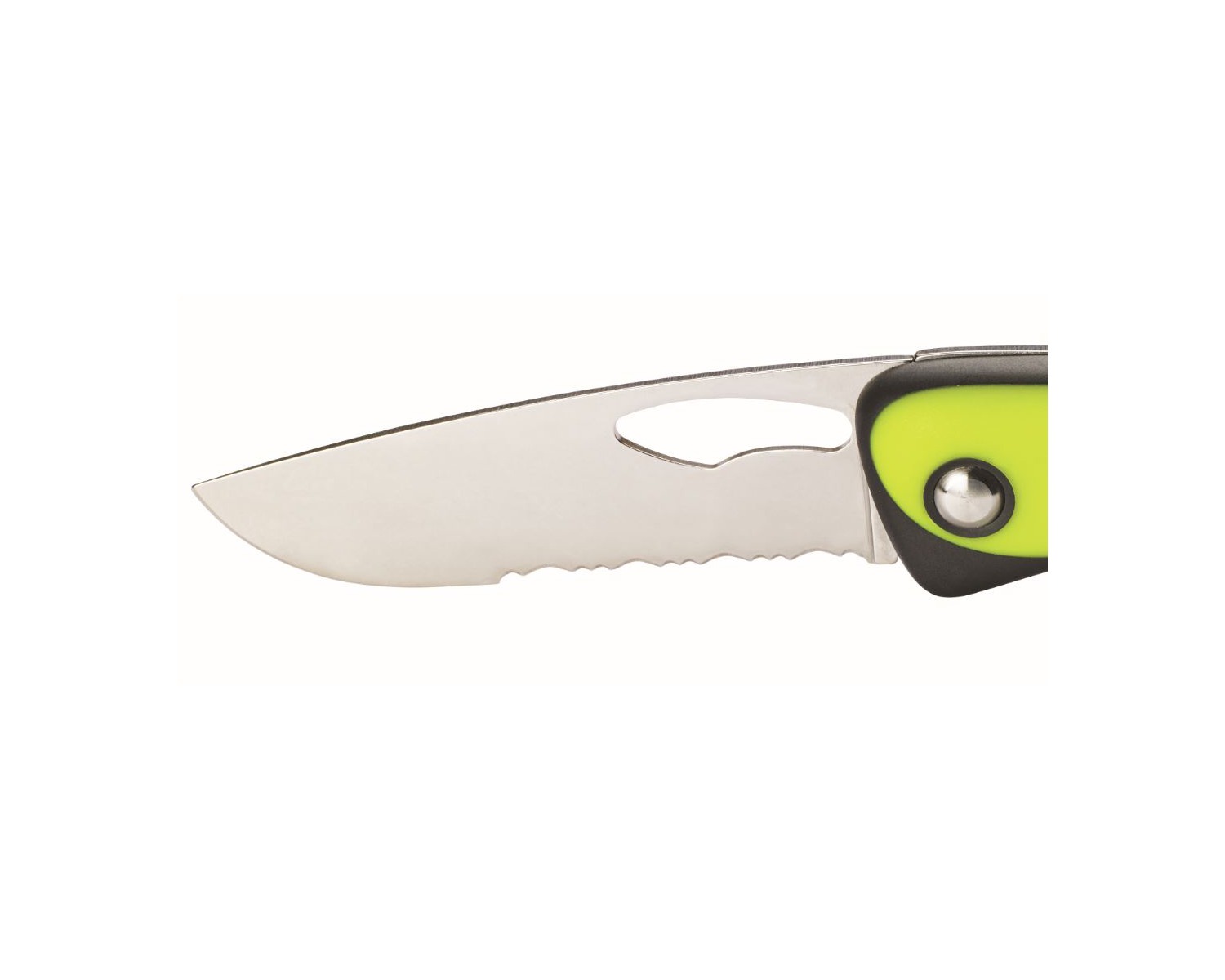 Le Couteau marin affuté en toutes circonstances, conçu pour la pratique de la voile et les marins exigeants, le couteau « Offshore» offre des fonctions essentielles à bord d’un bateau : qualité de coupe, visibilité de nuit, blocage de lame, ouverture une main, résistance à la corrosion, résistance mécanique... Sa lame crantée permet de couper efficacement tous types de cordages modernes comme le Dyneema. Cette version démanilleur – épissoir est aussi l’outil indispensable à bord d’un voilier.
