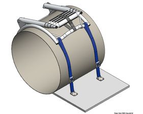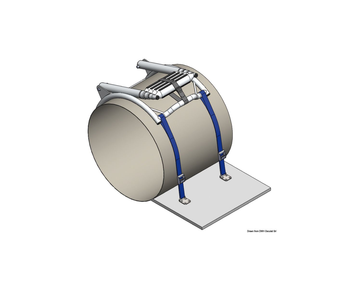 Fixation au plancher à l'aide de 2 plaques inox (fournies) et sangle réglable par boucle inox autobloquante