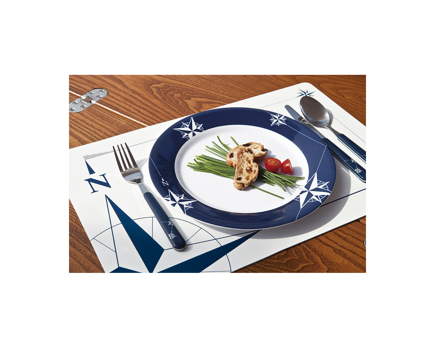 Les assiettes en mélamine de cette ménagère incassable ont un bord décoré bleu marine et blanc avec une rose des vents tout comme les autres ustensiles de la collection.