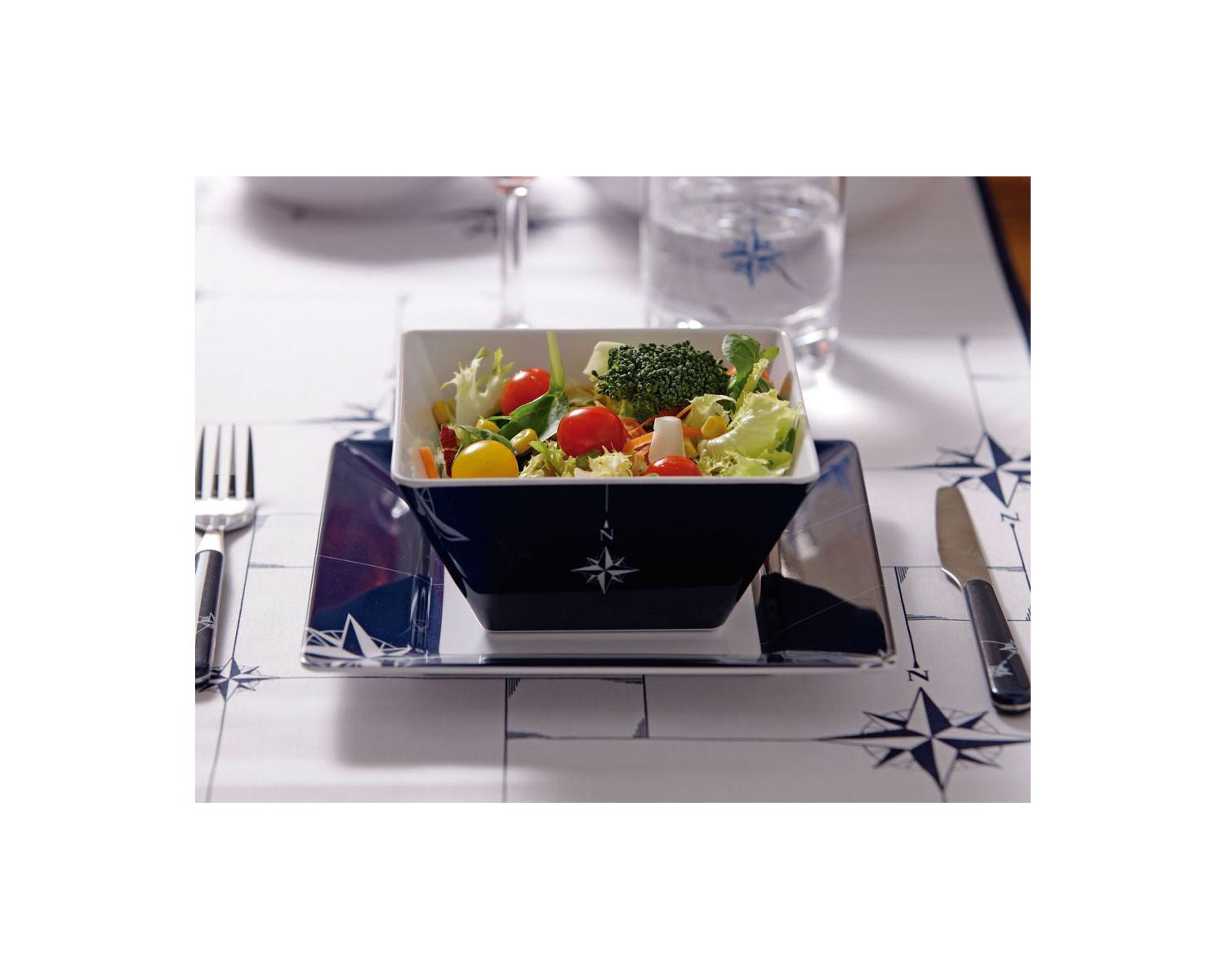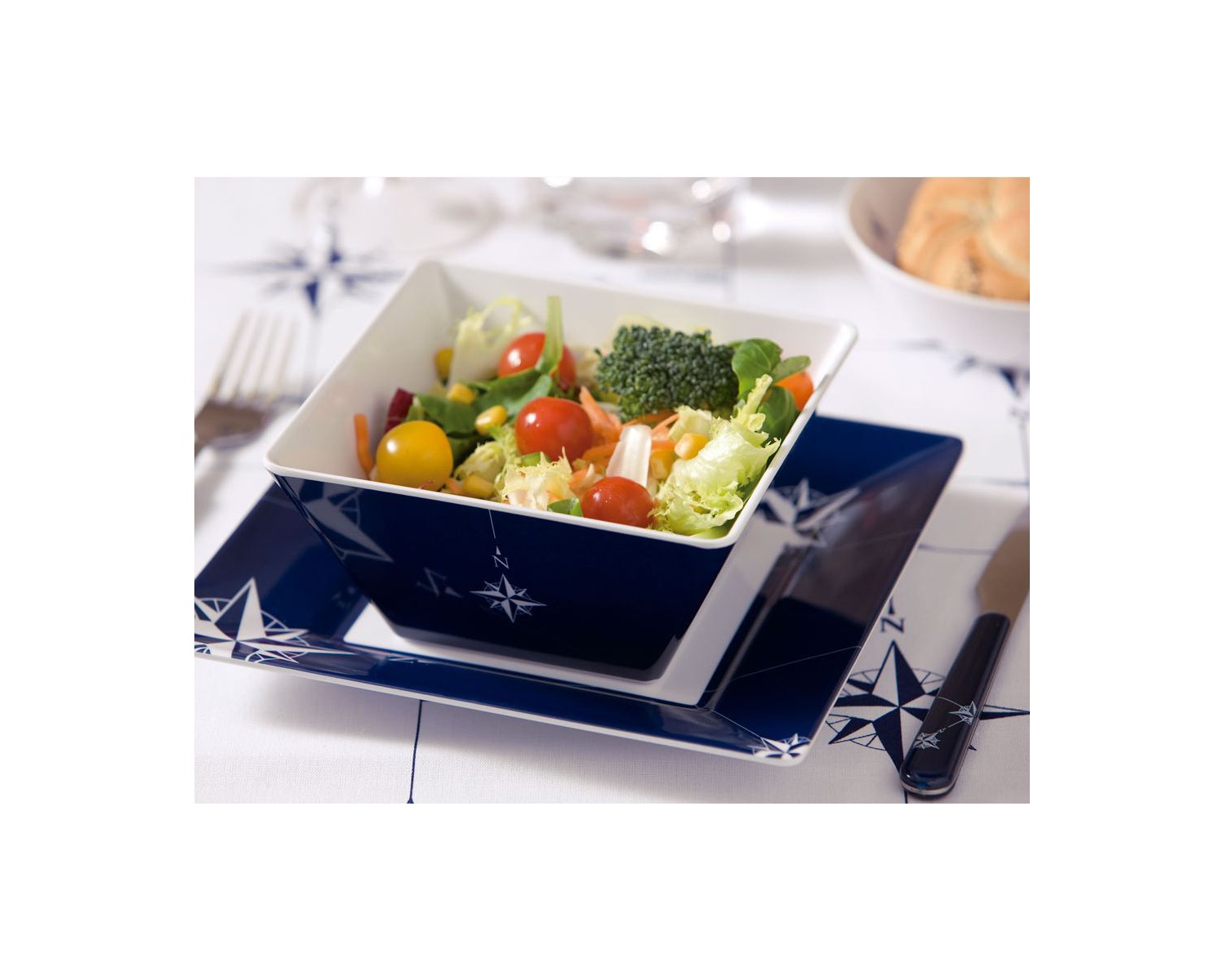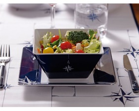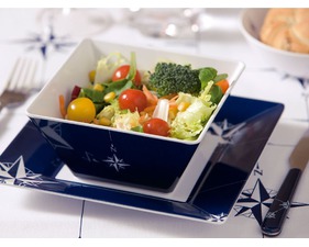 Le bol carré en mélamine fait partie de la gamme de vaisselle incassable NORTHWIND. C'est l'un des articles les plus fonctionnels de cette collection nautique.