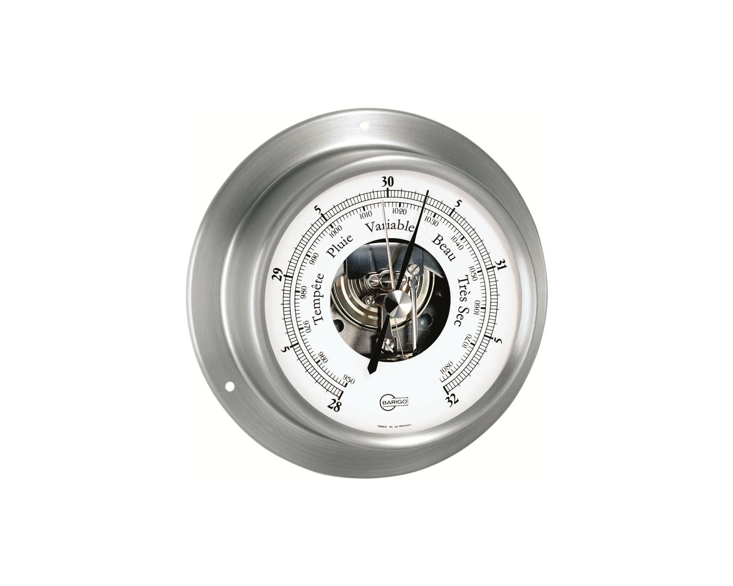 En acier inoxydable brossé, la série Sky de Barigo fabriquée en Allemagne est résolument moderne et fiable. Destinés aux installations en milieu hostile, elle est conçus pour des utilisateurs exigeants : la linéarité du baromètre est +/- 3 hPa entre 980 et 1030 hPa, avec une déviation par 10° de +/- 3 hPa. Livrée avec ses vis de fixation pour une finition parfaite. Dim. 110 x 32mm, poids 110g.