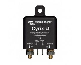 Les coupleurs de batteries automatiques Cyrix-ct connectent automatiquement des batteries en parallèle dès que l'une d'entre elles atteint une tension pré-établie (lors de la charge) et les déconnectent lorsque la tension chute en dessous du niveau "float" (en cours de décharge). Piloté par microprocesseur, le coupleur détecte la tendance pour fixer la tension de couplage ( de 13V à 13,8V et de 26 à 27,6V) et de découplage (de 11V à 12,8 V et de 22 à 25,7 V). Très faible chute de tension. En branchant sur les 2 bornes du Star Assist un bouton poussoir (non fourni), on peut forcer le coupleur pour le démarrage du moteur pendant 30s