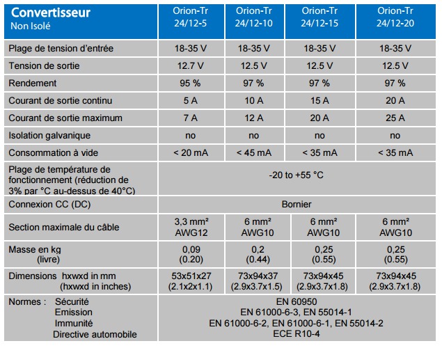 Le modèle Orion-Tr dispose d'une large plage d'entrée de 16 à 35V, et d'un rendement élevé de 88%. La consommation à vide reste inférieure à 100 mA.