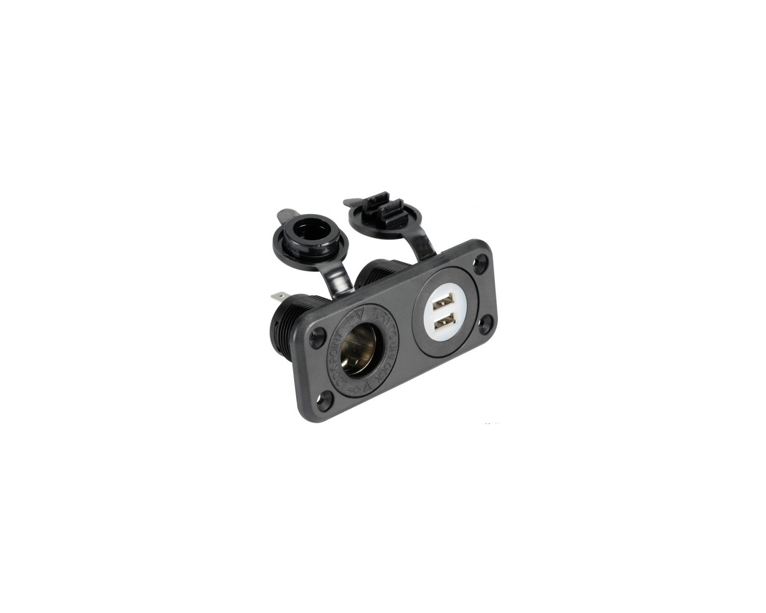 Equipement encastrable pour l'amélioration de votre tableau électrique, cet ensemble double prise USB 2 x 2,1 A + Prise allume cigare femelle 12V permet de recharger la majorité de vos équipements tels que télephone portable, VHF, mais aussi de brancher vos équipements directement sur la prise allume-cigare à hauteur de 15A.