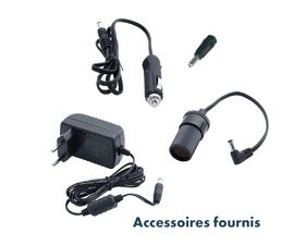 3 modes de charge : secteur 230V (8 h), voiture 12V (5 h), panneau solaire 30W (6 h)
