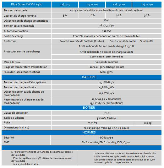 - Sortie de la charge avec une fonction de déconnexion en cas de tension faible de la batterie.