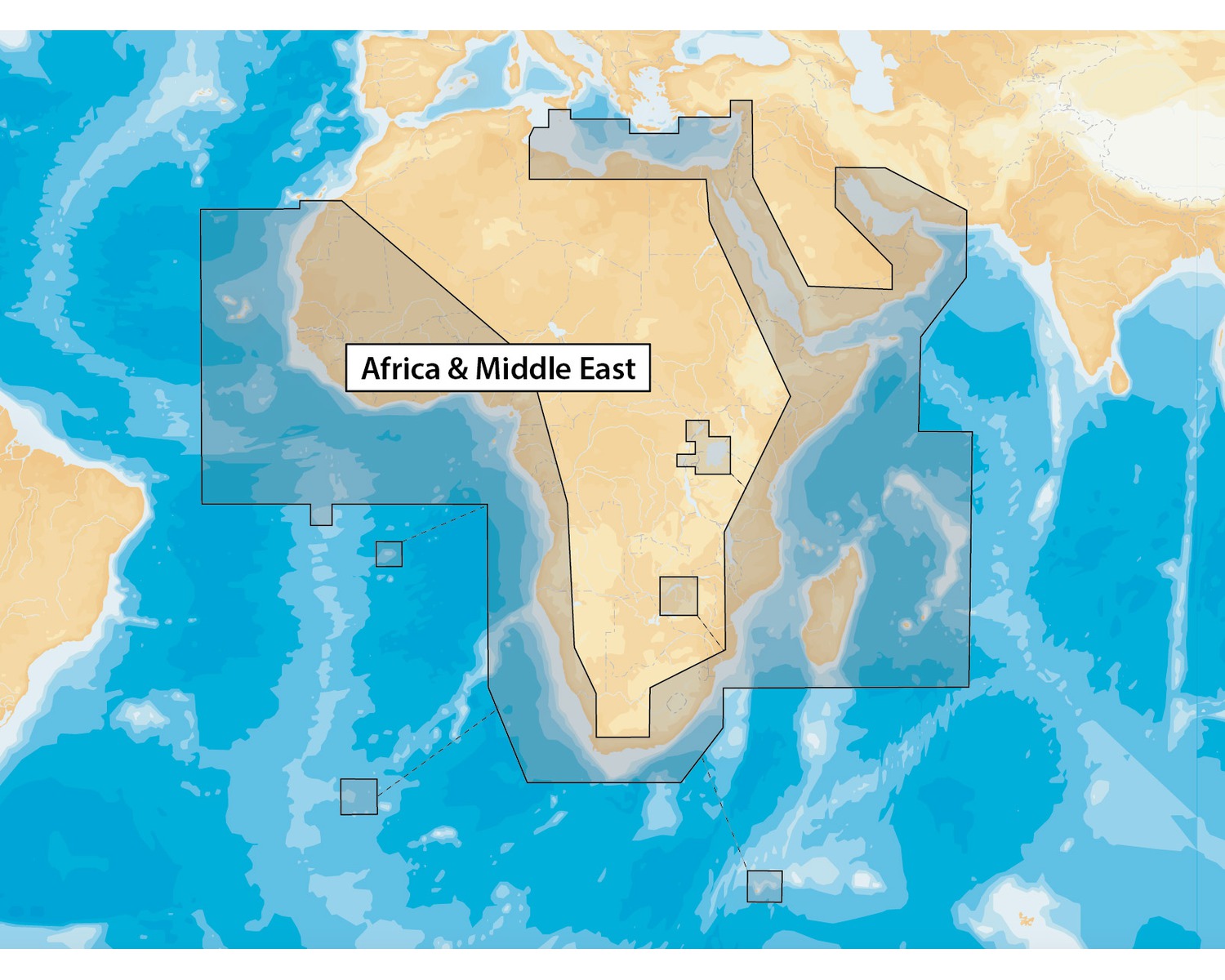 30XG AFRICA & MIDDLE EAST Western Sahara, Mauritania, Senegal, Gambia, Guinea Bissau, Guinea, Sierra Leone, Liberia, Ivory Coast, Ghana, Benin, Nigeria, Cameroon, Gabon, Congo, Angola, Namibia, South Africa, Tanzania, Kenya, Somalia, Madagascar, Comoros, Aldabra Islands, Seychelles, Socotra, Lake Kariba, Red Sea, Persian Gulf. Including Cape Verde Islands, Gulf of Guinea, Gough Island, Tristan da Cunha, Gulf of Oman, Gulf of Aden, Victoria, Albert & Kivu Lakes and Mediterranean Sea from Tripoli to Beirut.