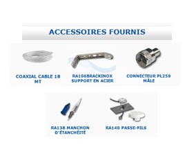 Antenne VHF 3dB 0m90, fouet en fibre. Fournit complet avec câble, support, connecteur, etc