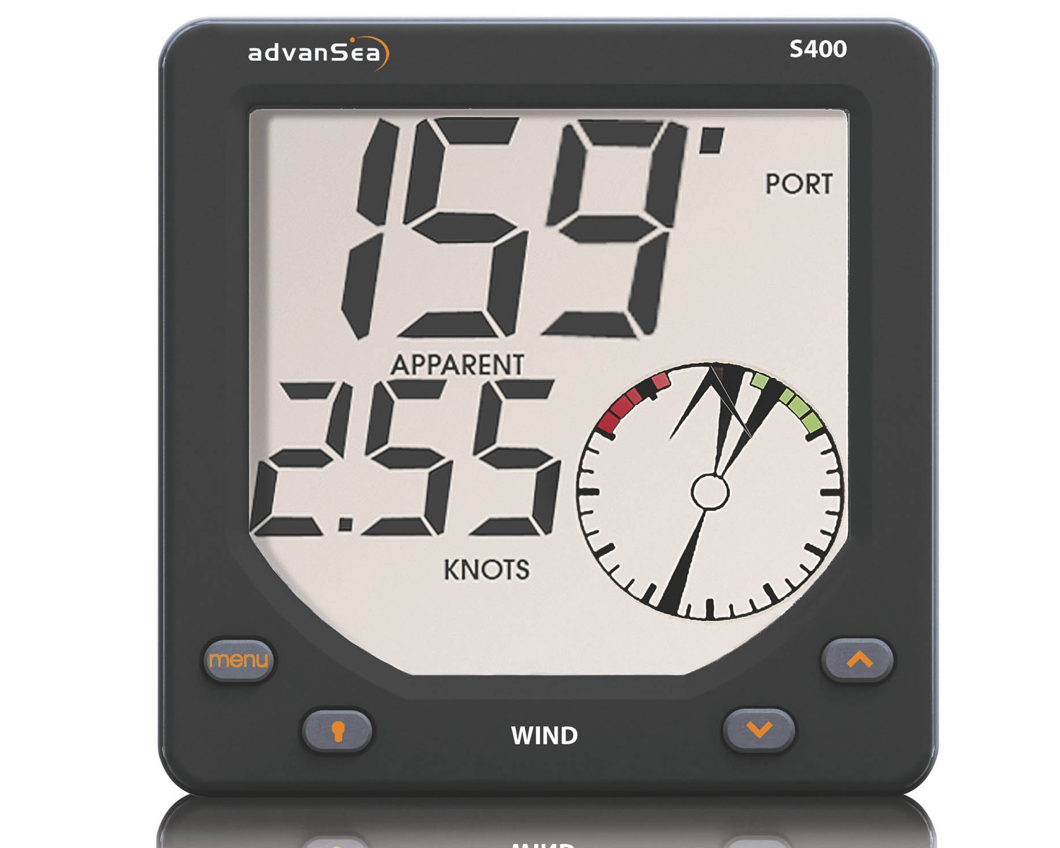 Girouette à affichage Numérique. Vitesse de 0 à 199 nœuds, direction du vent, indication de tendance, angle et vitesse du vent réel et apparent, alarme vent fort. Résolution 1° en direction. Affichage des caractères 32 mm info principale, 22 mm info secondaire. Connexion NMEA 0183 et Bus advanSea.