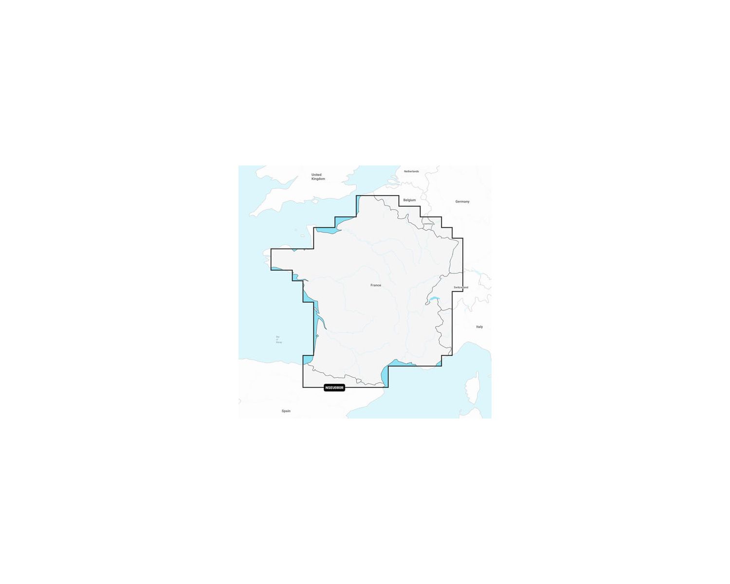 Couverture détaillée de l'intérieur de la France, y compris les systèmes de l'Adour, de la Garonne, de la Charente, de la Loire, de la Seine et du Rhône. La Sèvre-Nantaise, la Somme, la Meuse, la Moselle et la Saône, le Rhin de Bâle, Suisse à Karlsruhe, Allemagne ; Le lac Léman (Genève), le lac de Neuchâtel, le lac de Bienne, le lac de Morat, le canal du Midi, le canal du Centre et le canal Rhin-Rhône sont également couverts.