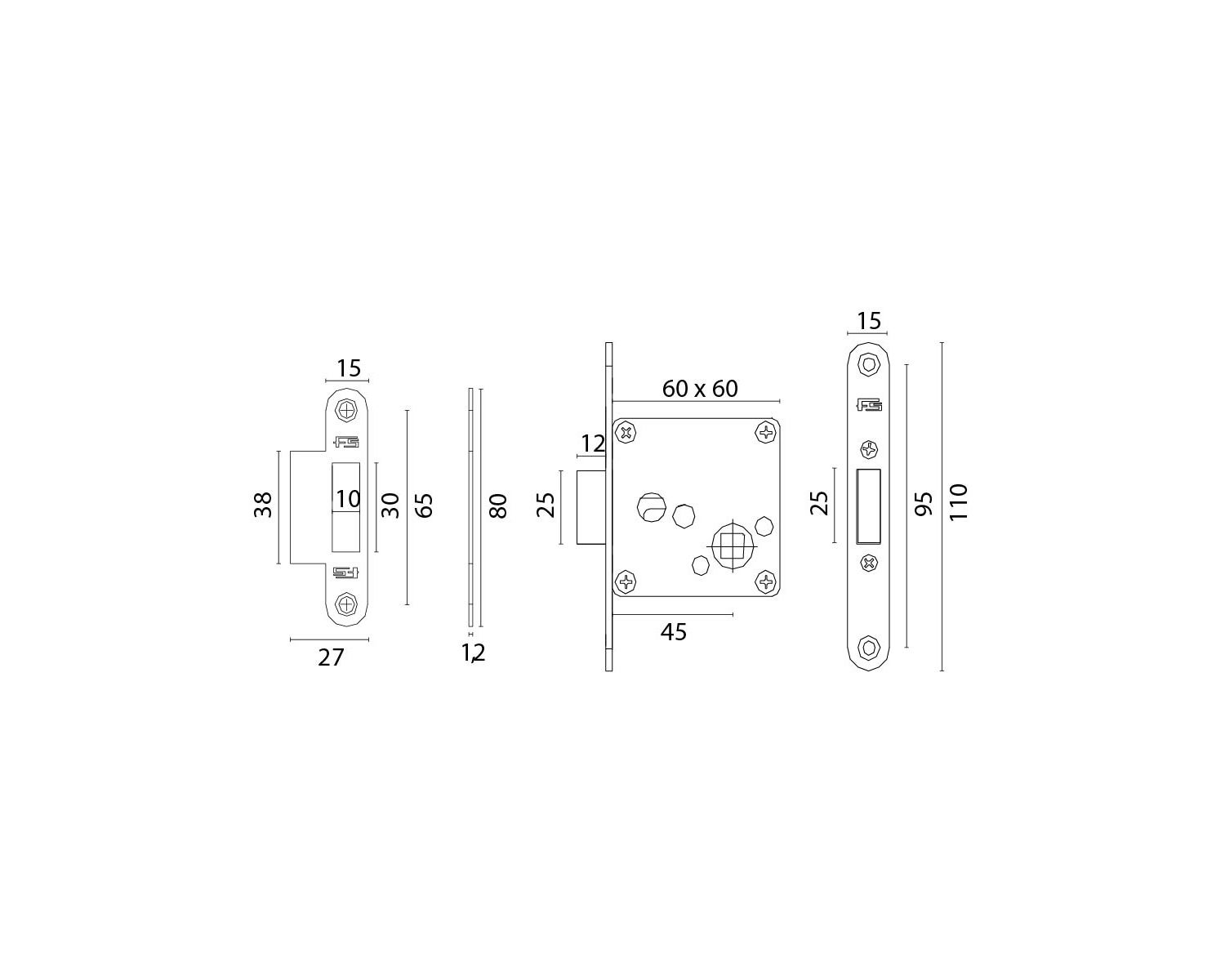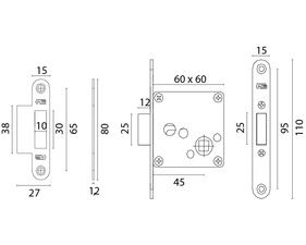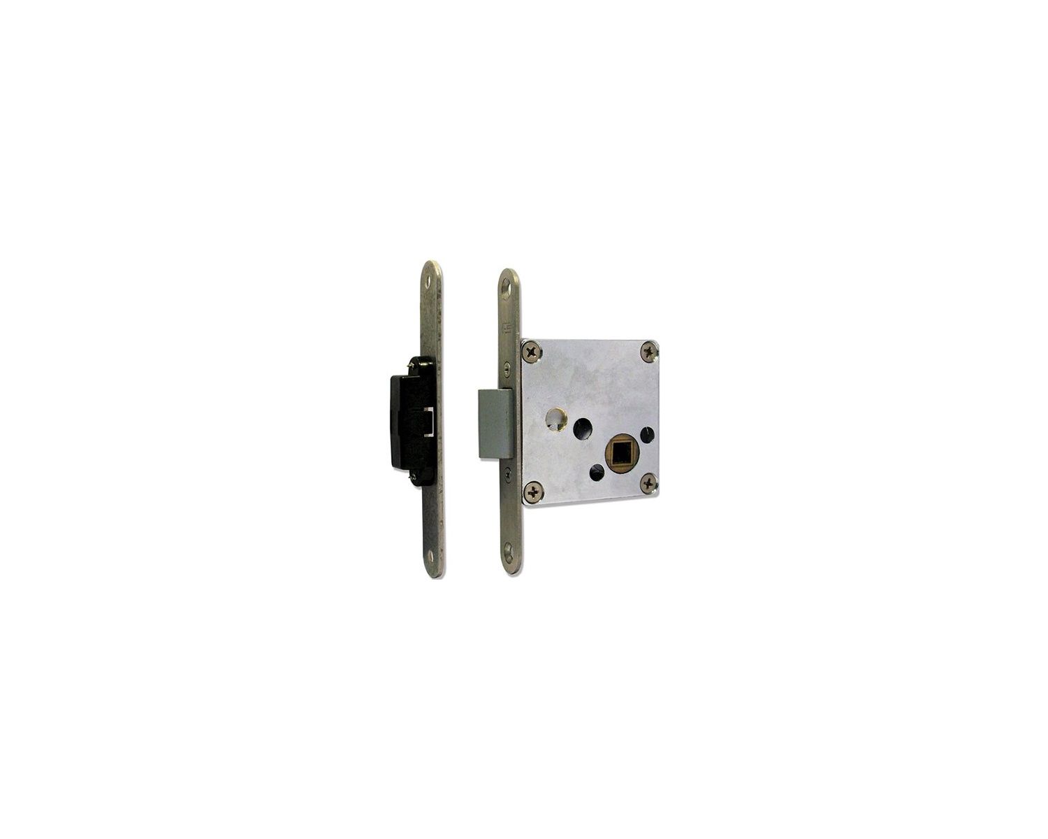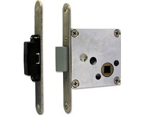 Serrure universelle en laiton avec plaque en acier inox AISI 316 L, possibilité de les combiner avec différentes poignées de notre production.