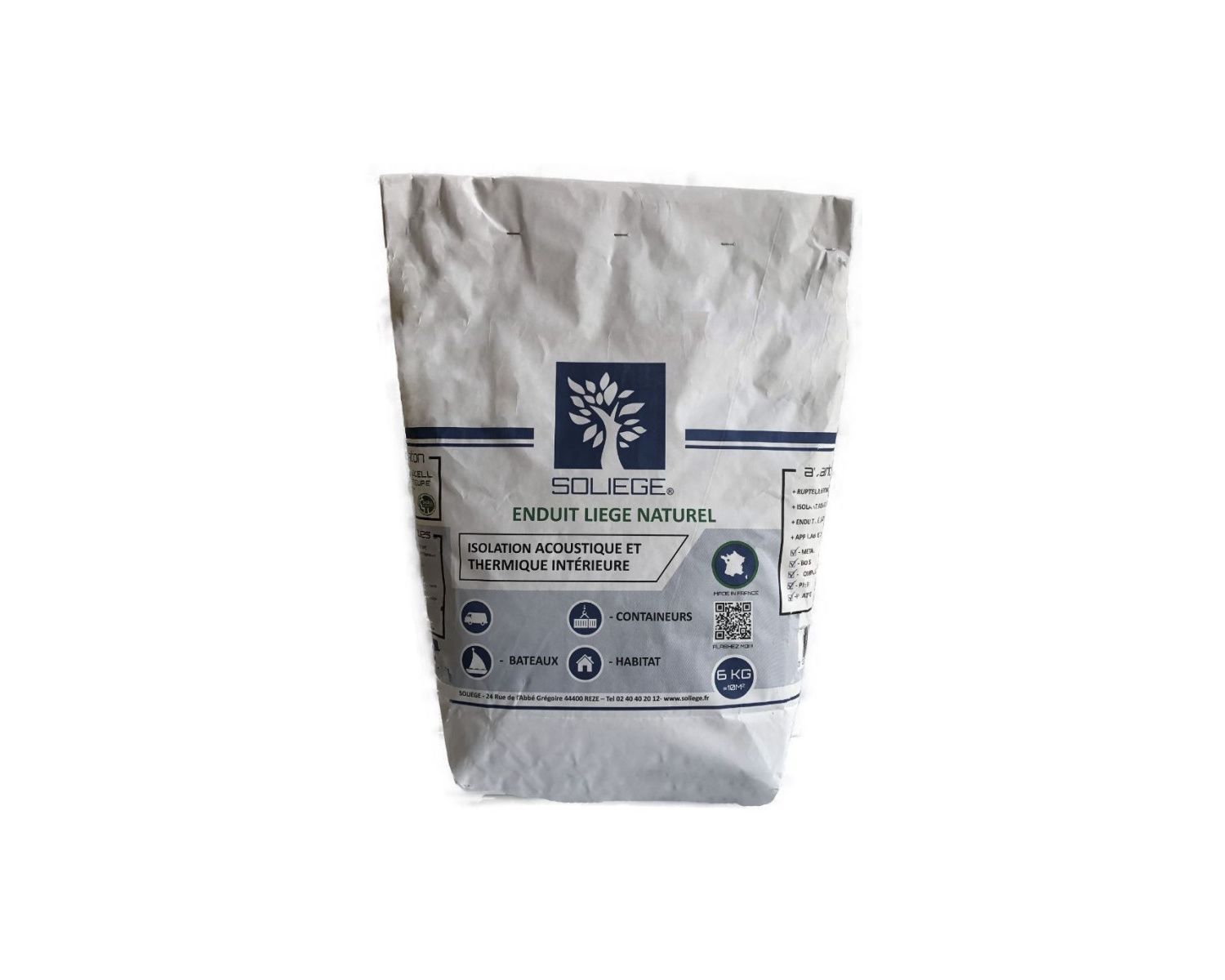L'enduit écologique SOLIEGE est un isolant thermique et phonique en sac de 6 kg (équivalent 12 kg prêt à l'emploi) à mélanger avec de l'eau.