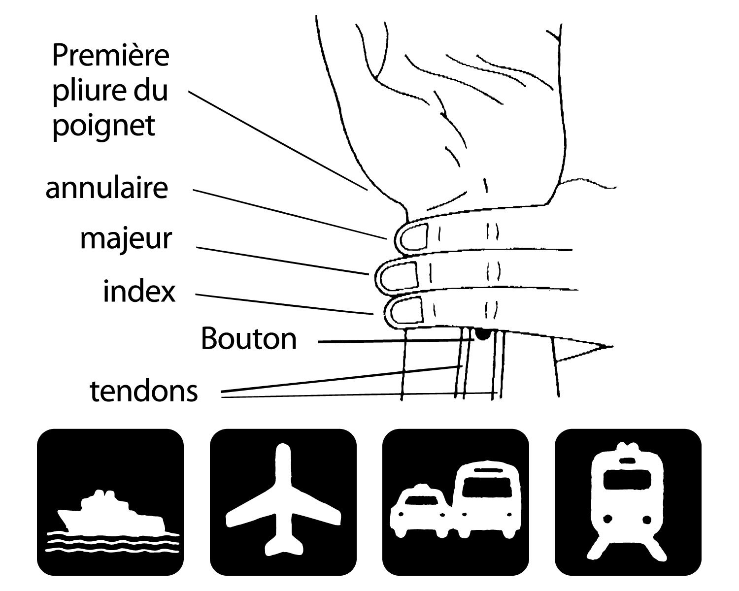 Mode d'emploi : Portez un bracelet Sea-Band à chaque poignet. La boule blanche doit presser contre la peau, sur le Point Nei Kuan de chaque poignet, comme indiqué sur l’illustration.Pour trouver le Point Nei Kuan, tournez la paume de la main vers le haut, placez les trois doigts de l’autre main (index, majeur, annulaire) sur l’avant-bras, l’annulaire contre la première pliure du poignet. Le Point Nei Kuan se trouve sous le rebord de l’index, entre les deux tendons fléchisseurs de la main.