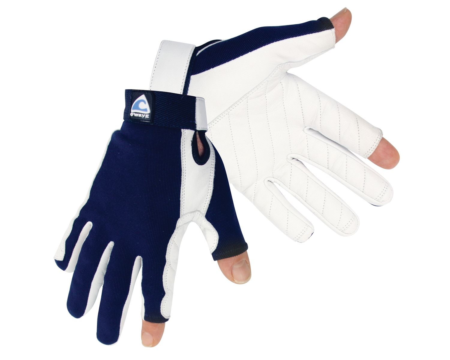 Gants ouverts pour le pouce et l'index en cuir souple traité eau de mer, poignet montant avec fermeture par bande auto-agrippante, dessus Spandex, renfort de paume enveloppant renforcé cuir.