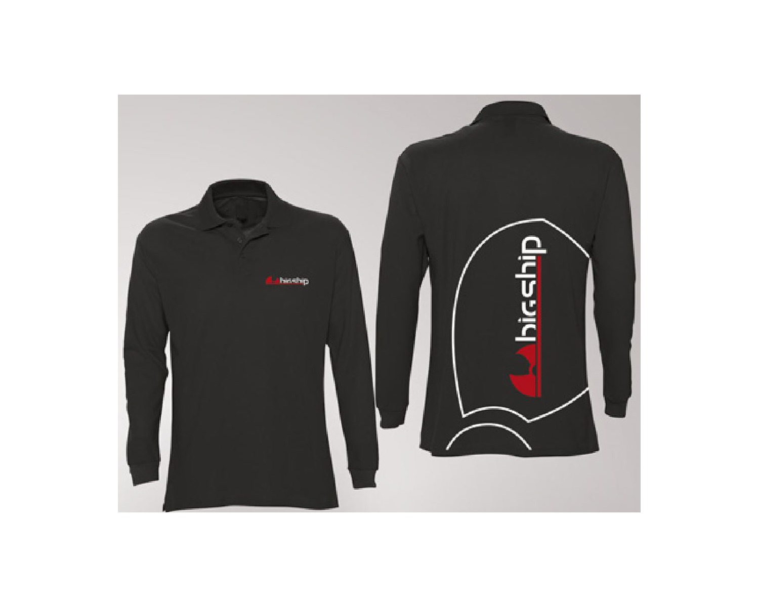Polo homme manches longues noir, impression bigship devant et derrière.