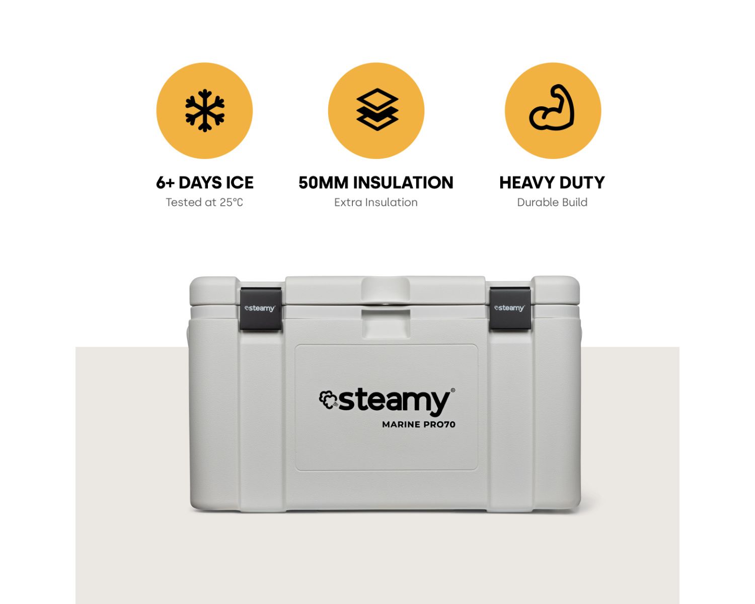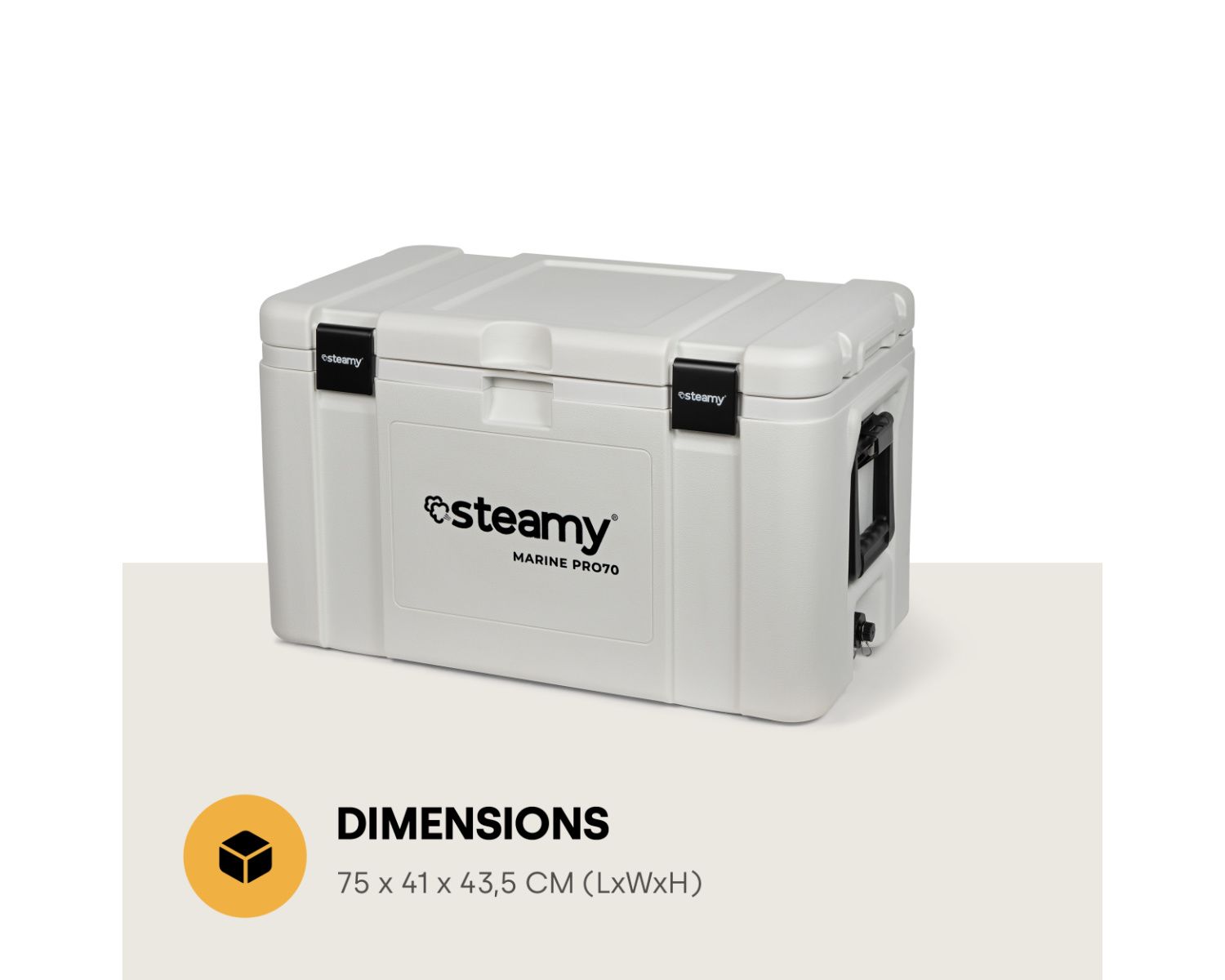 La Steamy Marine Pro a une capacité de 70 litres, ce qui est plus que suffisant pour toutes vos activités. Grâce à sa grande capacité de stockage, elle offre de la place pour toutes vos boissons, snacks et autres, tandis que l'isolation de haute qualité garantit que tout reste à la bonne température.