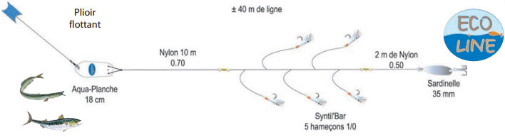 Composée d'environ 40m de ligne, 5 Syntil'Bar N°1/0, 1 cuillère Sardinelle 35mm, 1 planchette Aqua-Planche 18 cm.