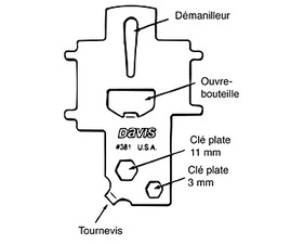 C'est également un outil pratique sur lequel on trouve deux clés plates 8 mm et 11 mm, un démanilleur, un tournevis et un ouvre bouteille.