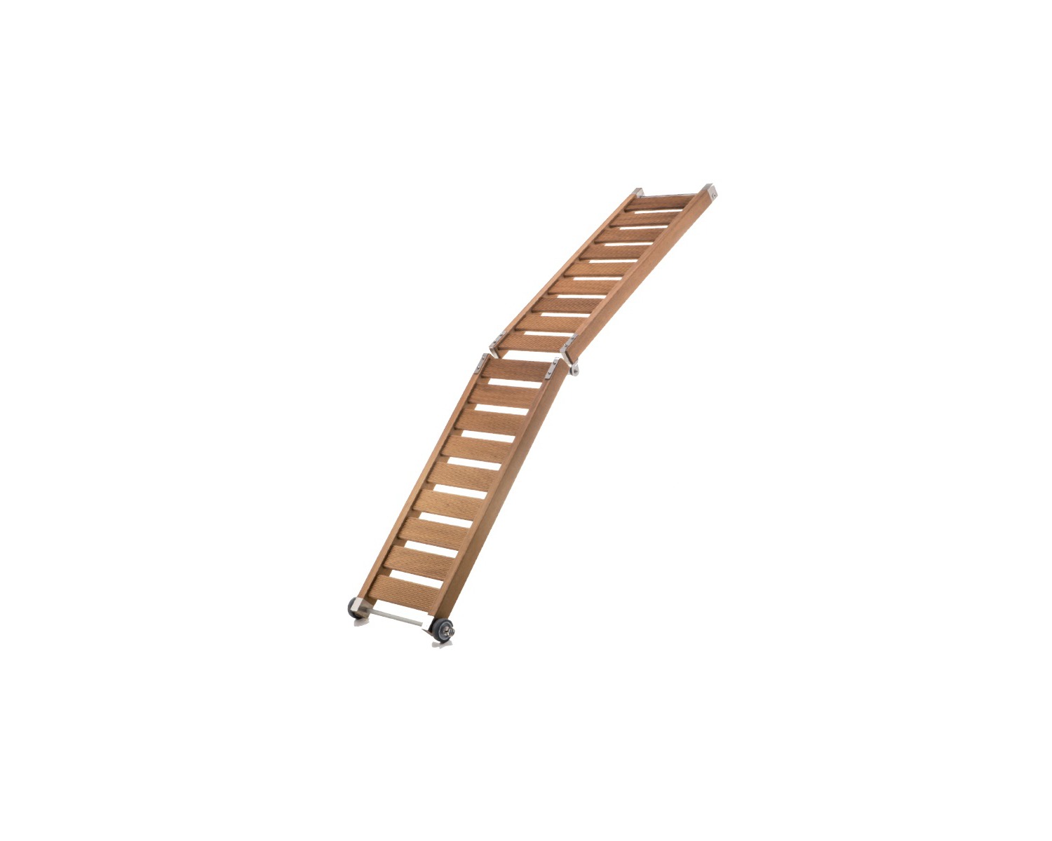 Passerelle pliante en 2 parties avec roues en téflon, structure en bois marin, articulations en Inox AISI 316.