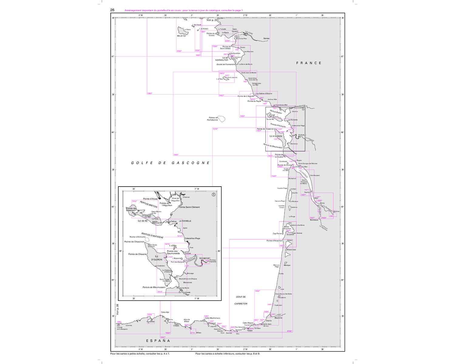 Les cartes de sédimentologie G, cartes développées afin de répondre aux besoins des pêcheurs et plongeurs et dans le but de leur donner une meilleure connaissance de la nature des fonds. Elles décrivent la répartition des différents types de sédiments (cailloutis, graviers, sables…), en complément des informations portées sur les cartes marines.