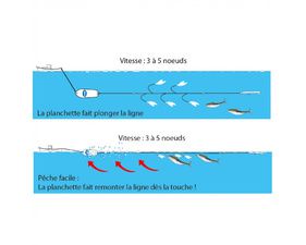 Traîne avec planchette assurant une nage et un équilibre parfait. Ligne montée par des pêcheurs confirmés et utilisant les meilleurs nœuds, dont la ligne de traîne AQUA-BAR est consacrée à la pêche au bar et au maquereau.