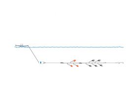 Pêche en surface: rallonger la ligne, derrière la planchette, de 10m, la planchette nage sur le dos et reste en surface.