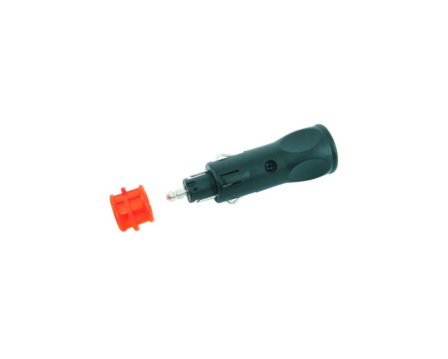 Fiche mâle type allume cigare + adaptateur pour prises DIN ø 12mm et protection par fusible.