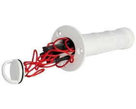 Compartiment étanche en thermo-polymère. Echelle avec montants en tresse nylon et marches en thermo-polymère haute résistance. Installation sur la ligne de flottaison. Très facile à utiliser: la personne à la mer tire l'anneau du bouchon de fermeture et cette operation permet de sortir l'échelle de son compartiment.