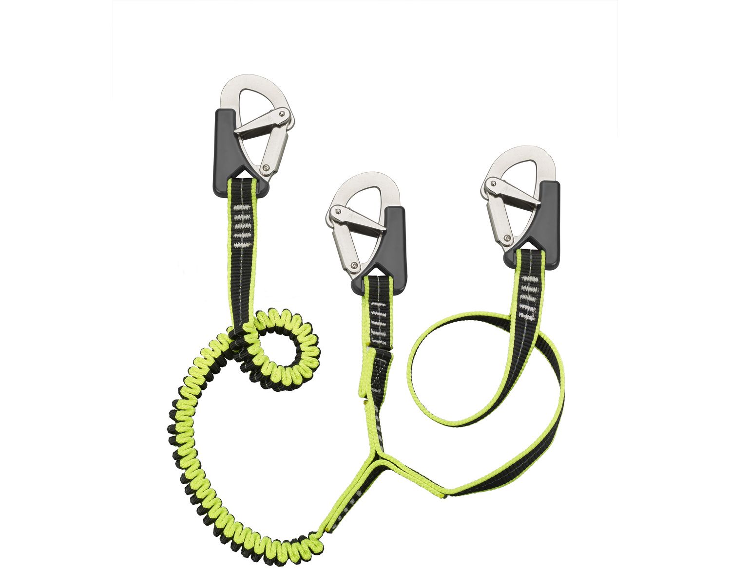 Longe élastique avec trois mousquetons inox à double sécurité et fermeture automatique