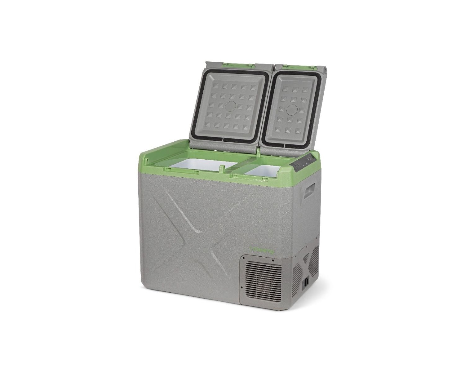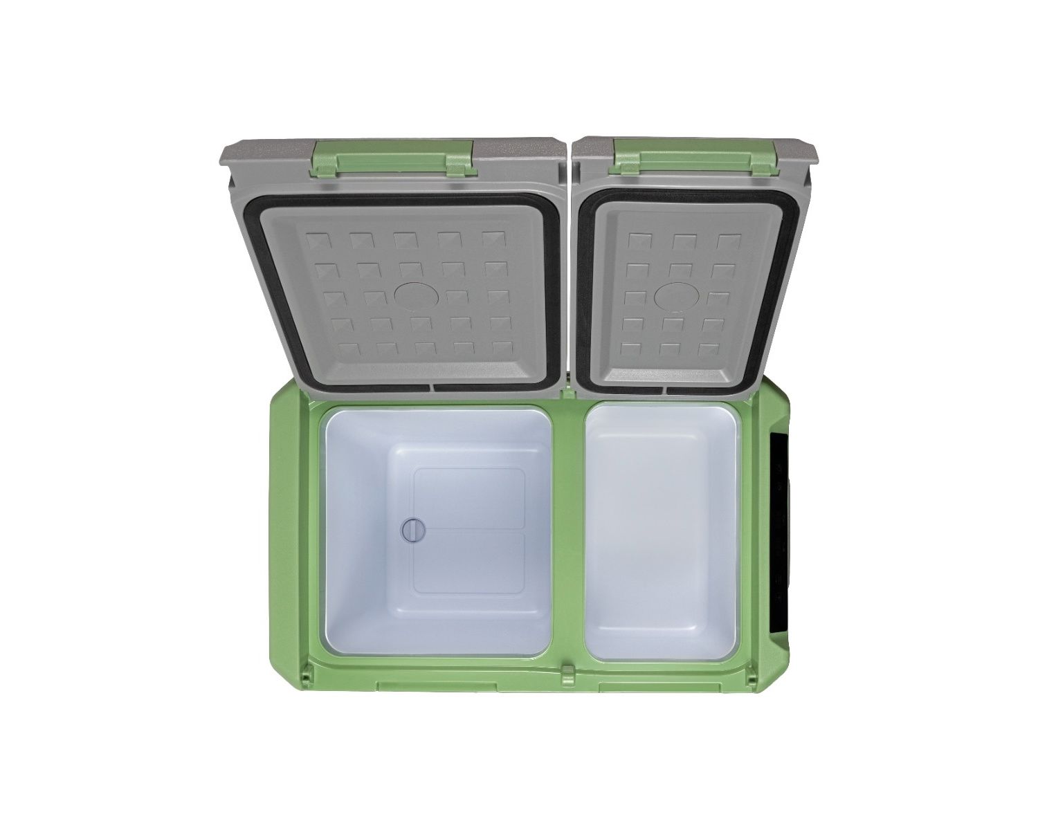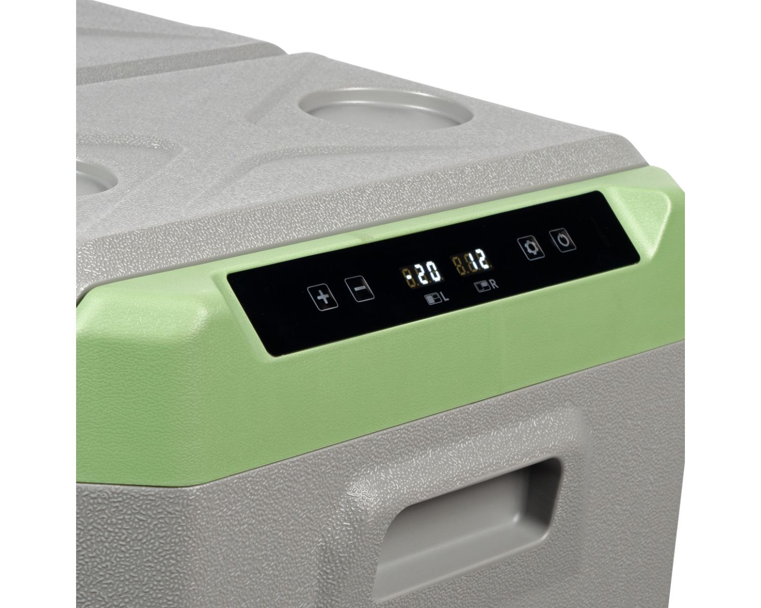 La combinaison d'une teinte grise sophistiquée et d'accents verts finis confère un aspect contemporain à cette glacière robuste. Tout autour, la glacière est isolée avec de la mousse, ce qui garantit une excellente conservation de la température. Deux couvercles séparés se trouvent sur le dessus, ce qui permet d'ouvrir et de fermer chaque compartiment séparément. L'écran LCD situé sur le côté permet de contrôler les deux compartiments. Les poignées moulées sur les côtés facilitent le déplacement de la glacière ainsi que son chargement et son déchargement.