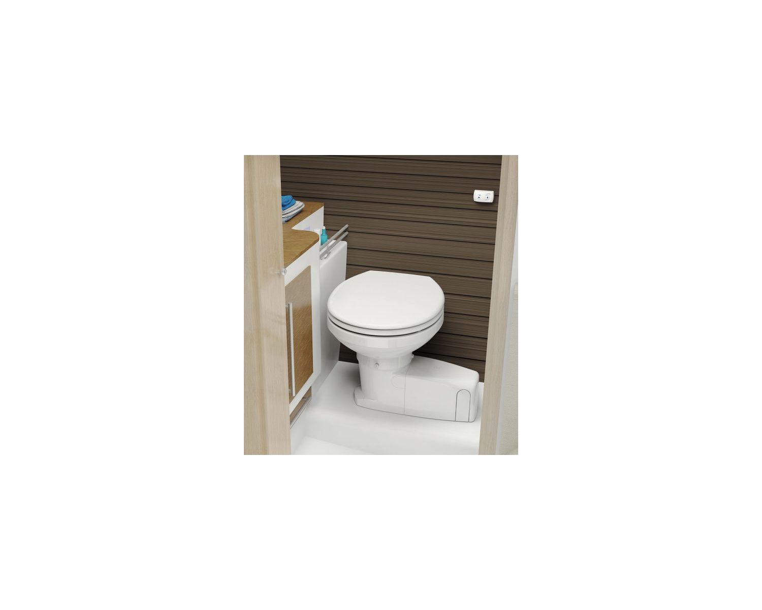 Dans ce cas, la pompe est électrique et automatise toute la problématique de chasse d'eau. Il suffit d'appuyer sur un bouton et le système se charge automatiquement de vider les toilettes, comme à la maison !